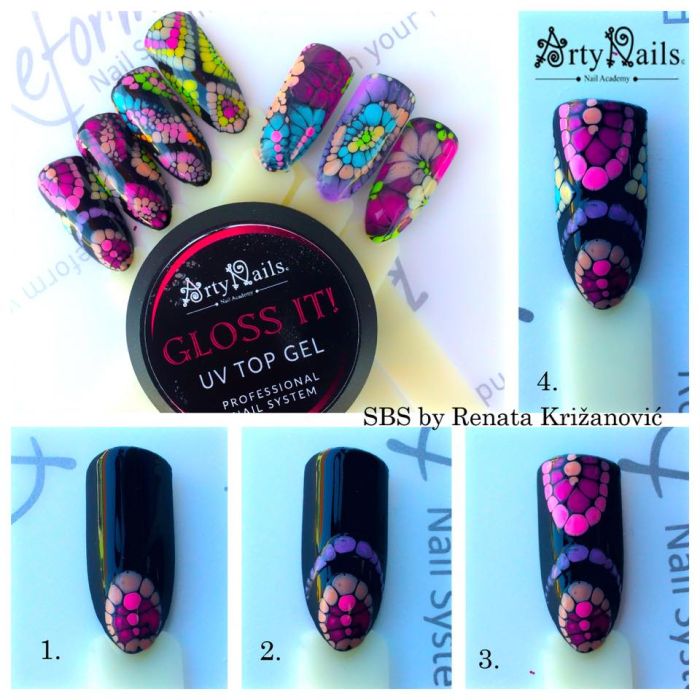 - Brug et dotting tool eller en nailart pensel, og påfør den ønskede farve og lav små eller store prikker